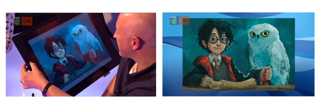 Made especially for the 5000th edition of the programme, Jonny was invited to BBC studios in Salford to create an original illustration of Harry Potter and Hedwig, Harry is wearing the diamond Blue Peter badge to mark the occasion.