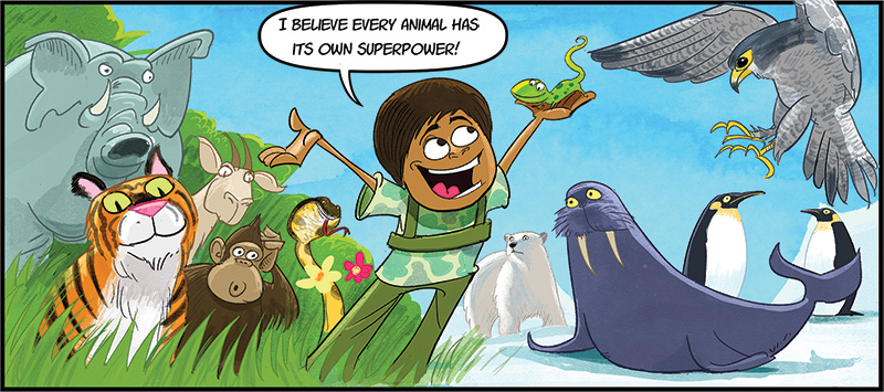 For this edition of the Guinness World Records I was drawing a comic strip about the extremely impressive Aneeshwar Kunchala who is the youngest documentary presenter in the world so I got to draw lots of animals - I particularly like tigers and walruses.