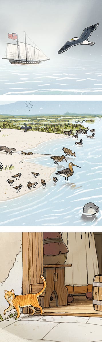 From the start one of the main focuses of the illustrations was to really emphasise how the landscape has completely changed since the 18th century. It’s relatively built up now, but back then it would have been a very wild, rugged landscape, so we made sure to include a lot of the wildlife that would have been much more numerous back then.