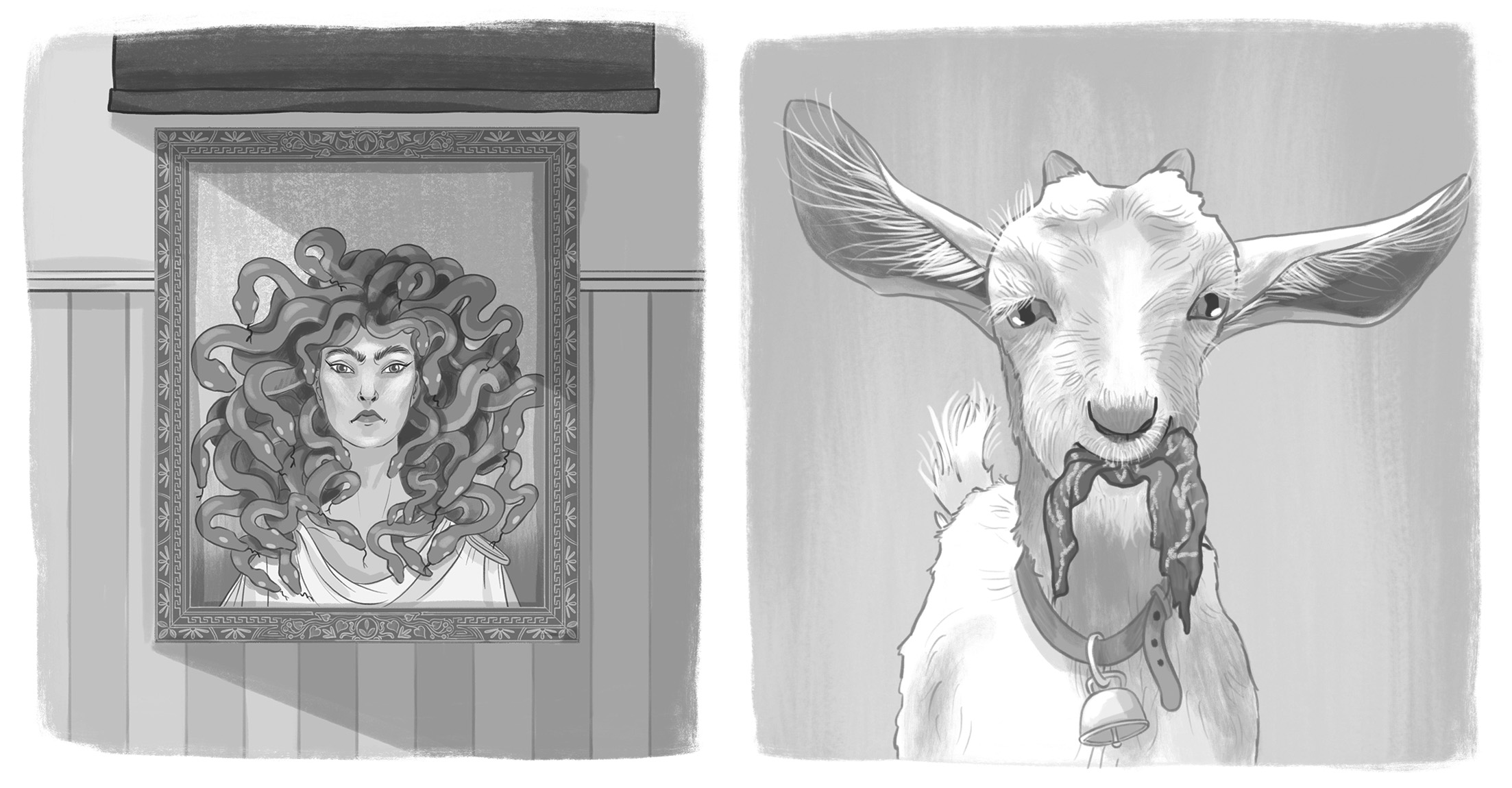 Scheduled to hit the shelves this month, Natalie Smillie has created a stunning cover treatment and internal chapter headers for Michelle Harrison's second fantasy novel, A Clock Strikes Murder. The follow up title to Twice Upon a Time, these absorbing mystery adventures have been captured perfectly by Natalie who has an innate skill for visual storytelling. Both cover titles feature vivid colours and striking silhouettes. Each chapter is highlighted by an intriguing header illustration, beautifully intricate in black and white - even featuring the ferocious face of Medusa.
